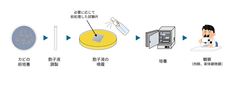 カビの生えやすさを調べたいサンプルに対し、カビの胞子をつけた後に、カビの増殖に適した温度・湿度の環境下に置きます(培養)。その後、肉眼や顕微鏡でサンプルを観察することで、どの程度カビが生えやすいかを調べる方法です。